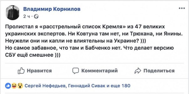 «Почитал список «подготовленных к убиению» журналистов. Понял, что российские киллеры узнают жертву никак иначе, как по дате рождения. А если серьезно – то этот список даже не писали. Просто скопировали список пресс-службы с днями рождения, перемешали. И получили очередное говно, которое нам пытаются скормить в виде «победы украинских спецслужб».