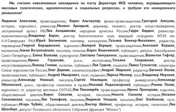 25 декабря участники некоего "Конгресса интеллигенции" под предводительством гражданки США и заслуженной «пгавозащитницы» Людмилы Алексеевой заявил, что "считает недопустимым сохранения праздника годовщины органов безопасности РФ" и даже именует сам факт празднования "подрывом конституционного строя". В ответ на слова о госизмене троцкистов и ельцинистов в «конгрессе» сообщили, что примером для подражания является начало 1990-х годов, когда "российское государство сделало решительные шаги для искоренения своей тоталитарной природы и приняло демократическую в своей основе конституцию. В ней и в законодательстве РФ определены правовые рамки для спецслужб, защищающие общество от возобновления политических репрессий". Также «пгавозащитники» потребовали немедленно уволить Бортникова за «идеологические принципы и политическую позицию несовместимые с занимаемой должностью».
