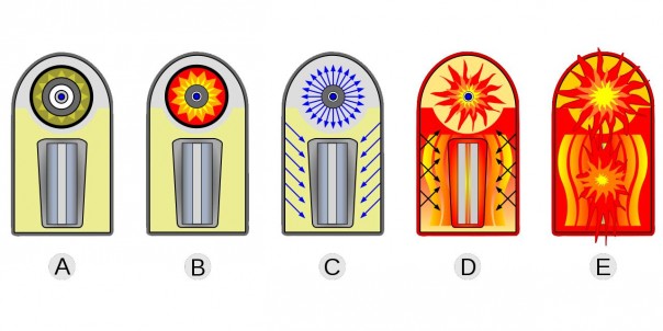 Начинается всё с первой ступени — так называемого триггера. Это простой атомный заряд (ну, может не совсем простой), а в нём уже всё стартует одновременным подрывом заряда обычной взрывчатки, хитрым образом обёрнутого вокруг делящегося вещества.