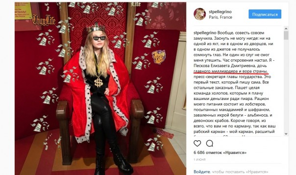 В своем инстраграме дочь Пескова признала, что счастлива, т.к. есть возможность сделать хоть немного этот мир лучше и помогать людям. Елизавета попутно призвала молодежь работать на заводах. Ее подписчики в instagram весьма неоднозначно восприняли эту новость. Одни принялись язвить, советуя не отказываться от красивой жизни в Париже с дорогим шампанским, "рабом Димой" и прогулками по красной дорожке Каннского кинофестиваля: "Детка, это не твое". Другие призвали Елизавету не обращать внимания на злопыхателей и пожелали ей удачи.