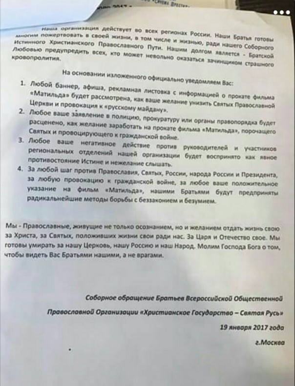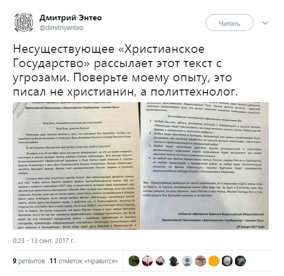 Кинотеатры, которые под угрозами экстремистов «христианского государства» отказались от показа фильма в ближайшем будущем ощутят на себе бойкот со стороны многих крупных кинокомпаний, а это потеря денег, это удар по бизнесу их владельцев. Само собой, вскоре начнтся внутренний срачь режиссеров между собой – терять деньги не хочет никто. Чем больше в замесе участвует сторон, тем нашим врагам лучше. Стороны, любящие замесы этого понять не могут, история с Украиной никого ничему так и не научила. А для западной пропаганды происходящее сейчас безумие так вообще находка. Образ нашей страны как агрессивного неадеквата с ядерной дубиной в руке они уже сформировали у себя там, а сейчас будут формировать образ всех нас, русских, ассоциируя его с «христианским государством».