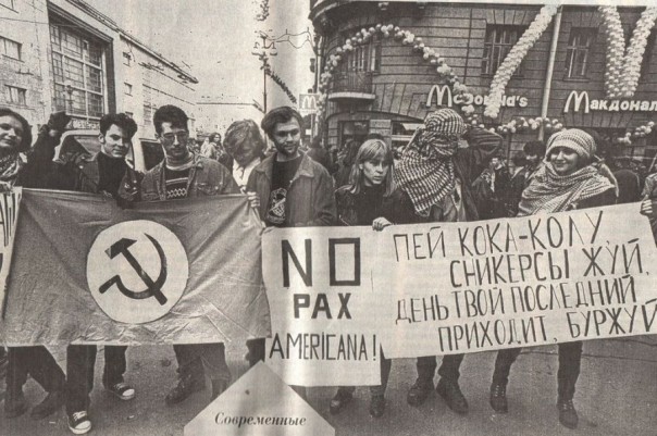 У меня тут накопилось немного картинок связанных с 90-ми. Удалять жаль, так что выложу. Картинки хорошие и показательные. Я комментировать особо ничего не буду. Рассуждать тут не о чем. 90-е, слава богу, стали уже историей. Собственно заглавная сделана в столице в 1995 году. В ту же пору в провинции устраивали вот такие показательные акции. До санкций еще целая эпоха.