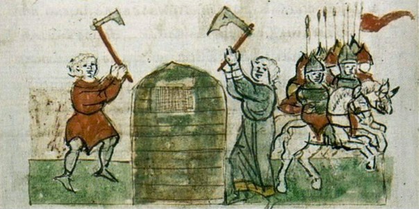 Киевляне с топорами освобождают Всеслава из поруба. Миниатюра Радзивилловской летописи