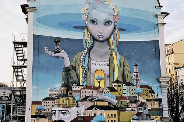 Сверху, с торцов панельных девятиэтажек, смотрят гигантские птицы - синица, сова, дятел, снегирь - на фоне райских кущ. Яркость оперения птиц и фантастических цветов в том рисованном мире и убогость и серость окружающей действительности заставиляет меня задуматься: а не сон ли это? Кажется, что Харьков застрял в лихом безвременье, где на полпути к реальной жизни засели и забуксовали сотни тысяч людей, потерявшие смысл своего существования и просто коротающие свой век где-то на краю вселенной.