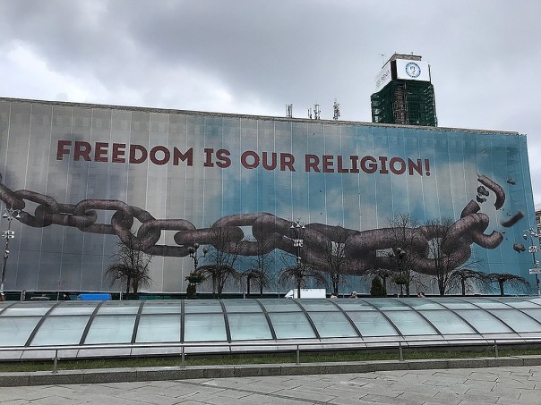 Дом профсоюзов на Майдане даже спустя четыре года по-прежнему затянут ремонтной сеткой. Надпись «Свобода - новая религия» заставляет думать о будущем, а не вспоминать о тех событиях, которые творились там.