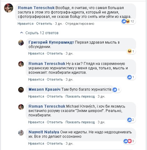 Нашлись и те, которые начали защищать ВСУшника с шевроном на фото и инструктор им ответил. Ниже в скрине выделены оправдания со стороны некоторых украинцев и затем идёт ответ израильтянина