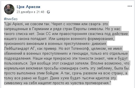 Израильский военный инструктор Цви Ариели тренирующий ВСУ написал возмущённый пост на тему украинского флешмоба в поддержку десантника ВСУ с нашивкой-символом дивизии СС Totenkopf («Мёртвая голова»)