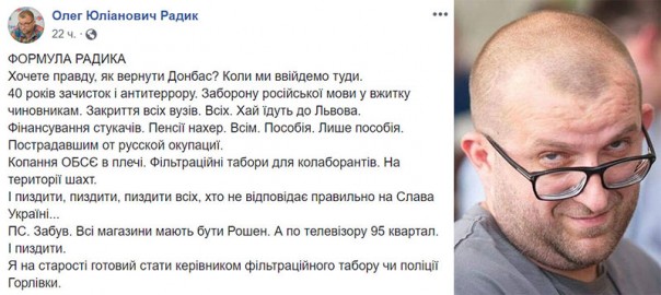 Радык саркастично добавил, что все магазины должны быть «Рошен», а по телевизору «95 квартал». «Я на старости лет согласен быть начальником фильтрационного лагеря или полиции в Горловке, — закончил свой кровожадный пост необандеровец.