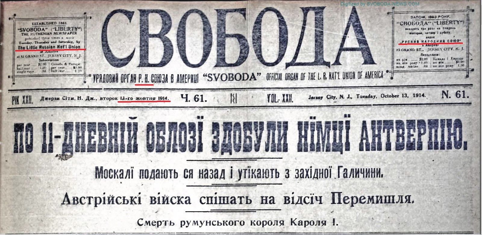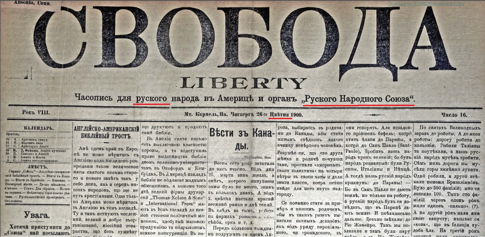Газета "Свобода", основанная выходцами из Австро-Венгерской империи, а именно - из Галиции, в 1893 году.