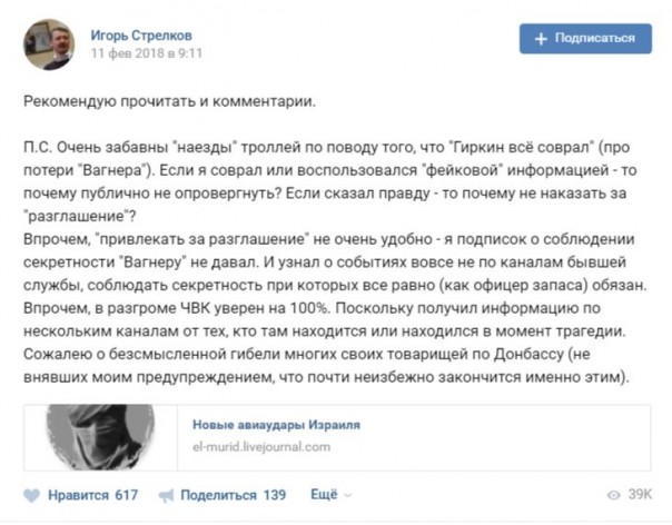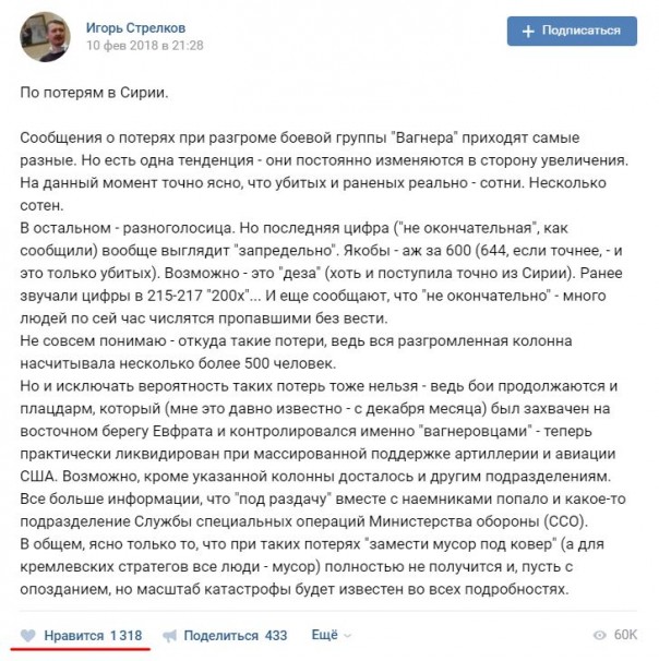 Стрелков пишет, что потери САА и российских добровольцев в Сирии исчисляются «сотнями». Более того, по его словам, - «под раздачу» попало и понесло потери какое-то подразделение нашего спецназа. И так далее, в своем фирменном - «обиженно-умном» стиле. Да вот, смотрите сами: