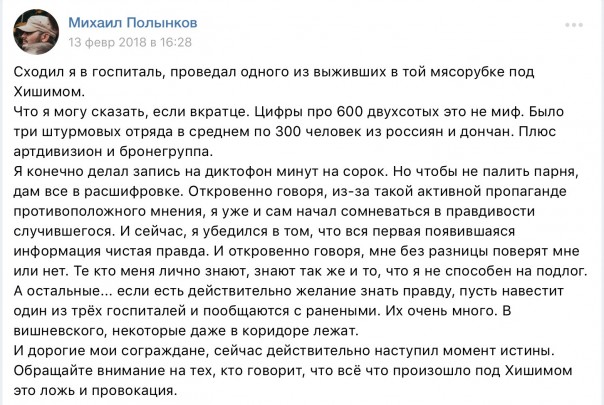 Вишенка на торте: пригласила в прямой эфир на News Front основной источник распространения информации. Который первым написал про посещение госпиталя и подтвердил заявленную 10 февраля «реконструктором» цифру в 600 человек.