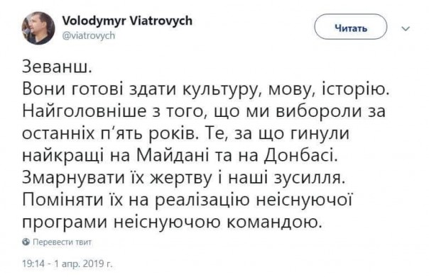 Технолог команды президента Виктор Уколов пишет, что «результаты первого тура вдохновляют его на борьбу». «Победили 37 кандидатов – победим и Зеленского», – уверен Уколов и предлагает методы распространения тотального компромата, прежде всего российского бизнеса Зеленского и его скрытых счетов, а также отношений с Коломойским.