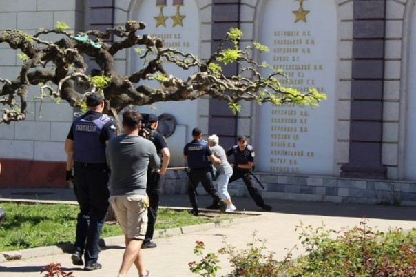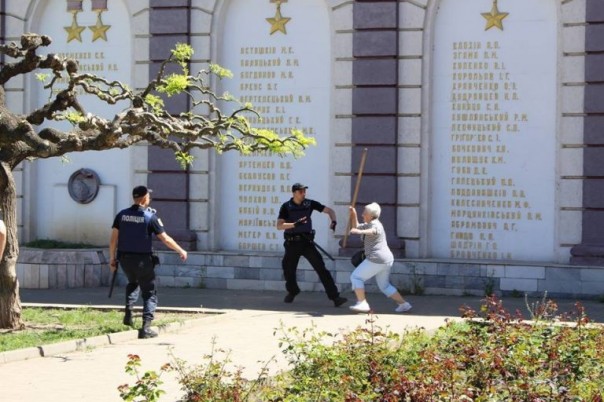 Так, в Одессе пожилая женщина вступила в конфликт с радикалами, напавшими на первомайскую демонстрацию, после чего ее задержали полицейские, от которых пенсионерке пришлось отбиваться древком от флага.