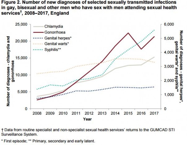 Новых случаев заболеваемости среди английских содомитов в 2017 г. и по отношению к 2016 г.: гонорея - 21 346, + 21%, хламидиоз - 14 765, + 17%, сифилис - 5592,+ 17%.