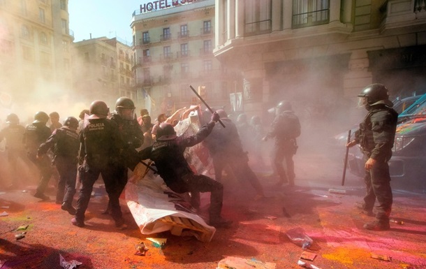 Стычки начались после того, как один из участником марша за отделение Каталонии бросил фиолетовую краску в человека, который вышел на акцию в поддержку испанской полиции.