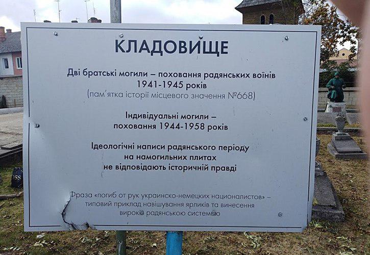 На украинских военных кладбищах начинают размещать информационные таблички, предупреждающие о якобы недостоверности надписей на памятниках советским воинам.