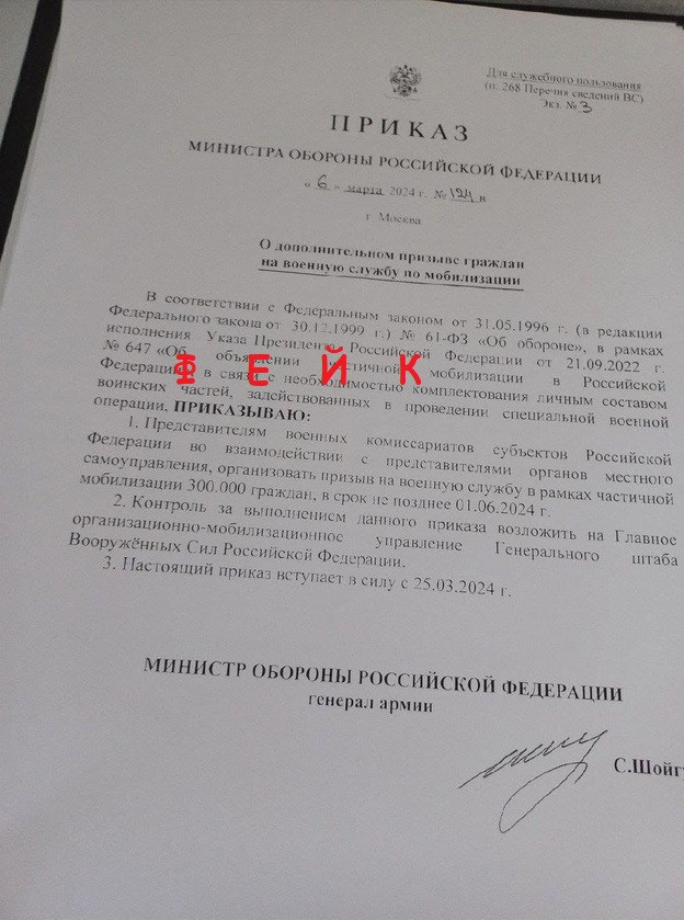 В соцсетях и мессенджерах получило распространение фото фейкового приказа министра обороны РФ Сергея Шойгу о начале новой волны мобилизации. Начало мероприятий якобы ожидается после президентских выборов — с 25 марта.