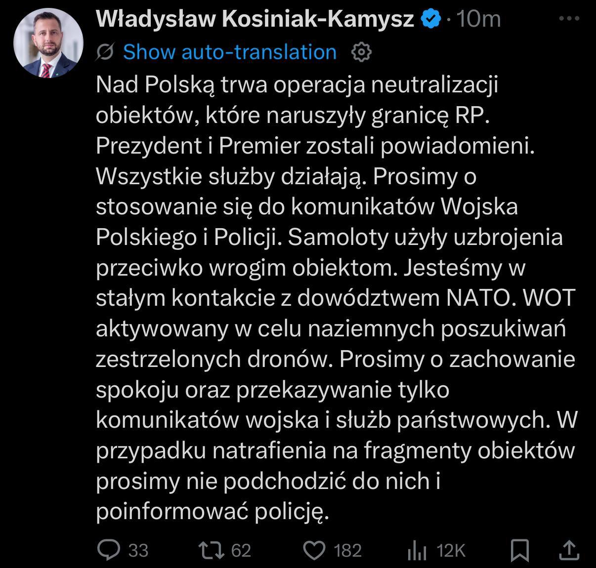 Главным событием суток становится реакция Польши на якобы заход «Гераней» в свое воздушное пространство на 50 км. Польское Минобороны и президент сообщили (на скриншоте) о контрдействиях против воздушных целей, также писали о взлете истребителей F-16 ВВС Польши для перехвата беспилотников и работы средств ПВО у Жешува.