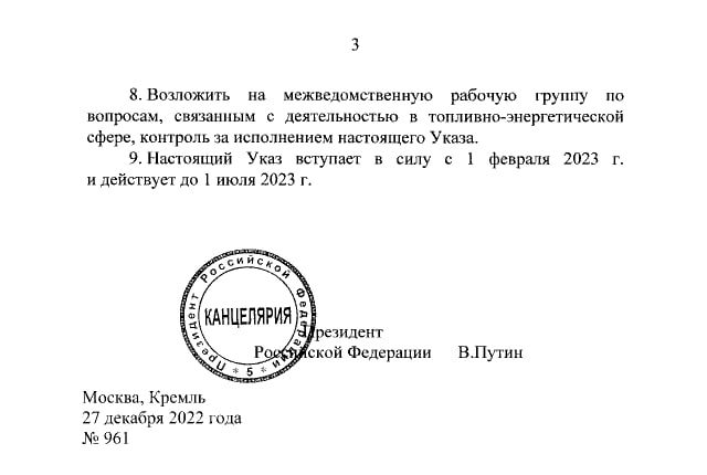 Владимир Путин утвердил указ о спецмерах в связи с установлением некоторыми государствами предельных цен на нефть и нефтепродукты, соответствующий документ опубликован на портале правовой информации.