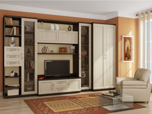 Гостиная – это самая мультифункциональная комната в доме. Это немного детская, немного спальня, иногда рабочий кабинет и даже, если мама не увидит – чуть-чуть кухня ☺. Поэтому стенка у гостиную должна быть такой же универсальной. Чтобы там можно не только установить телевизор, но и обустроить мини-библиотеку, бар или гардеробную. Чем больше отделений, полочек и шкафчиков будет в стенке, тем легче будет организовать пространство и место для каждой мелочи в доме.