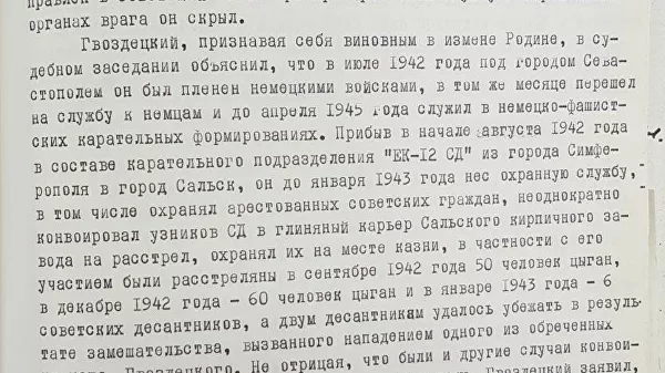Согласно показаниям Гвоздецкого, которые также рассекречены сейчас, с его участием в сентябре 1942 года была расстреляна группа из 50 цыган, в декабре 1942 года - 60 цыган, а в январе 1943 года - шестеро советских десантников. Причем, как вспоминал Гвоздецкий, среди убитых цыган было много детей.