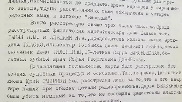 "Карьеры кирпичного завода №1 были местом, где совершались эти злодеяния. Фашисты ежедневно привозили сюда на машинах группы граждан, нередко доходившие до более чем 100 человек, здесь их расстреливали и сбрасывали в котлован. Таких котлованов, наполненных трупами расстрелянных, насчитывается до 30", - указывалось в документе. Схема кирпичного завода с указанием мест захоронений убитых, составленная на основе показаний свидетелей в КГБ СССР в 1963 году, тоже рассекречена сейчас.