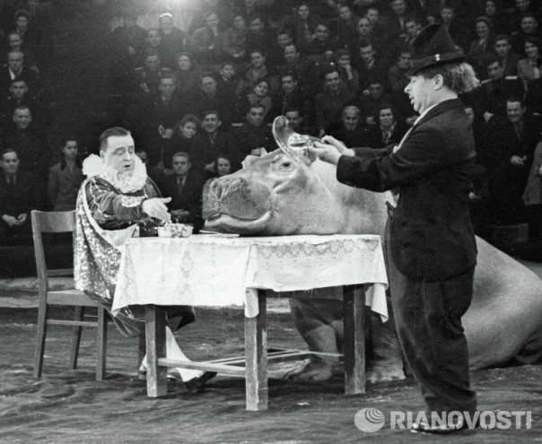 Цирковые артисты Владимир Дуров (слева) и Карандаш (Михаил Румянцев) на арене, 1957 год
