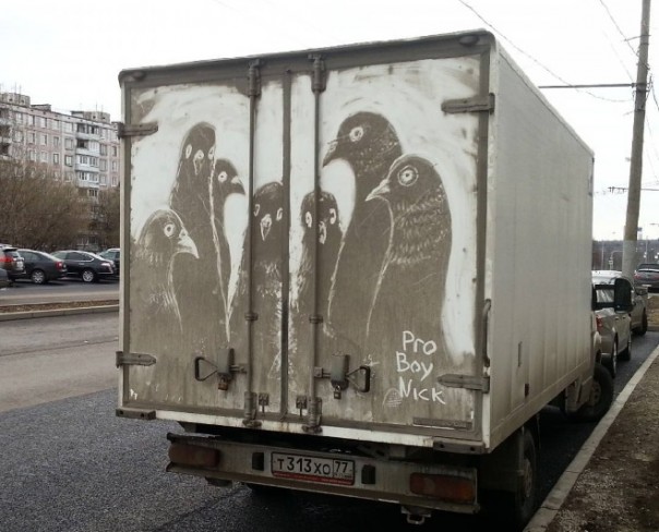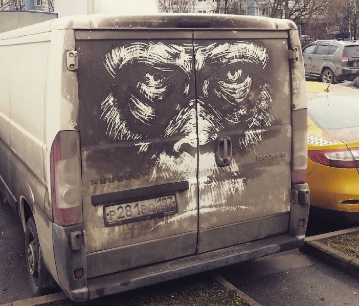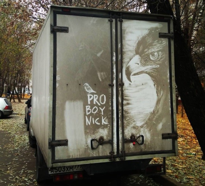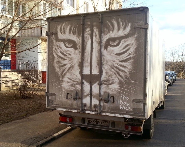 На улицах Москвы можно встретить автомобили, покрытые недолговечной графикой: линии, проведённые на пыльной и грязной поверхности машин, складываются в изображения людей или животных. Автор этих картин – 37-летний Никита Голубев, работающий под псевдонимом ProBoyNick.