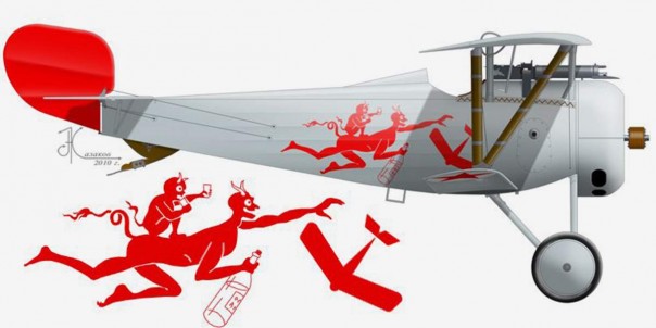 Летать часто приходилось на чём попало, а уж про обслуживание согласно инструкциям никто и не заикался. Зато можно было вовсю развлекаться с краской и кистями. Например, украсить свой «Ньюпор-23» огромной ведьмой, хватающей беззащитный неприятельский самолёт, — как у лётчика Петренко.