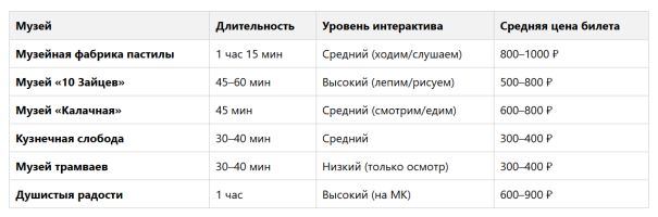 Важный совет: Билеты во все перечисленные музеи (особенно в «Калачную», «Пастилу» и на мастер-классы в «10 Зайцев») нужно бронировать заранее, минимум за 3–4 дня до поездки. В выходные попасть туда «с улицы» практически невозможно.