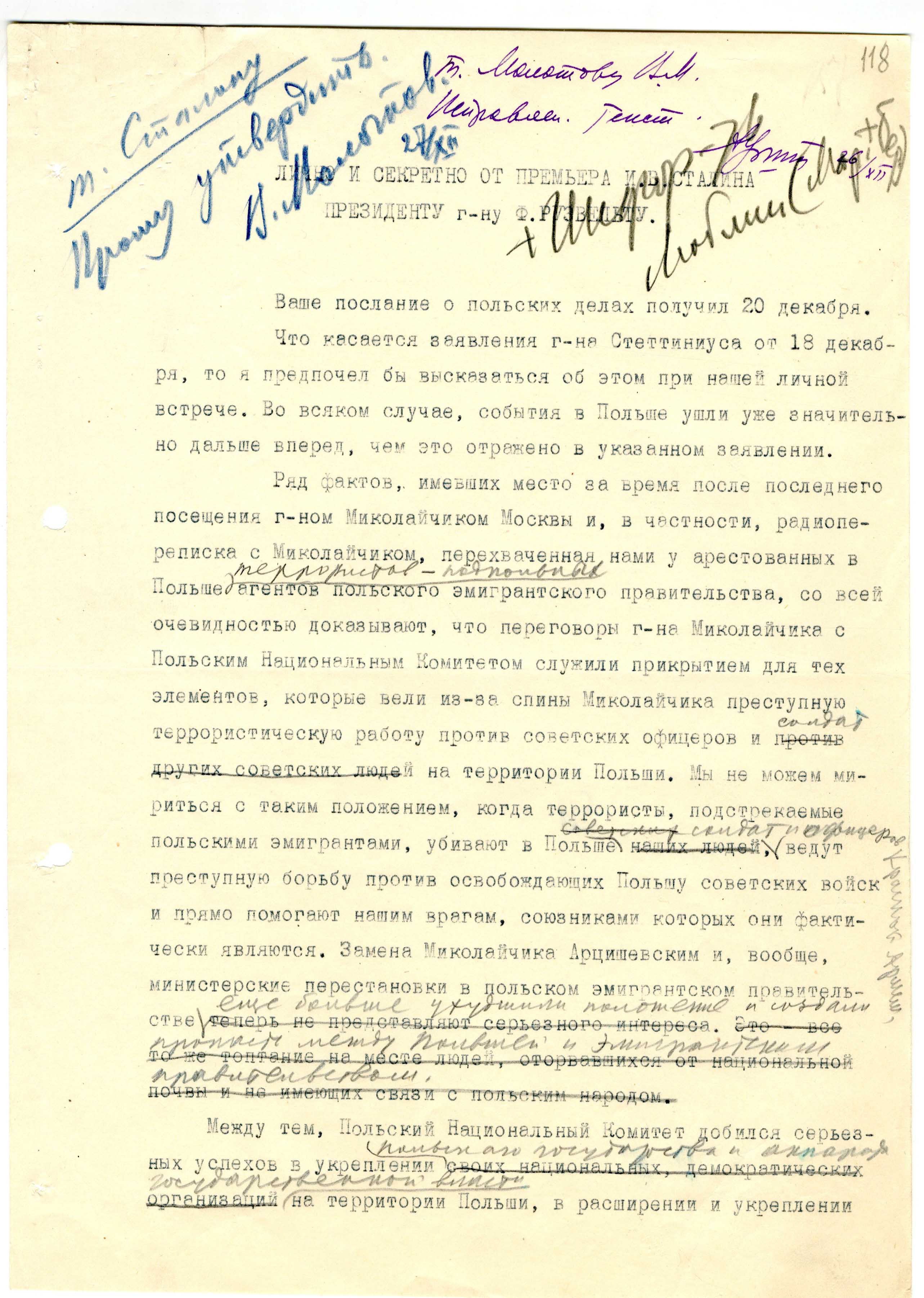 Андрей Артизов: Мы публикуем часть стенограммы Ялтинского совещания от 6 февраля 1945-го года, где Сталин говорит о том, что польский вопрос его очень тревожит. Советский Союз на своих плечах выносит основную тяжесть борьбы за освобождение Польши, борется с Германией. А тут ситуация, когда мы не можем гарантировать безопасность своих тылов, когда происходят террористические акты против военнослужащих Красной армии, против обеспечивающих тылы подразделений, в том числе медицинских и ветеринарных служб… Как к этому относиться, задает вопрос союзникам глава советской делегации? Рузвельт просит вернуться к этому вопросу чуть позже, берет короткую паузу. Возвращается к себе в апартаменты Ливадийского дворца и в ту же ночь диктует ответ Сталину на бланке Белого дома, как будто бы пишет из Вашингтона. Его передает Молотову госсекретарь США Стеттиниус утром на следующий день. Из этого ответа видно, насколько аккуратно подходит президент Соединенных Штатов Америки к вопросу о том, чтобы не было никаких лишних разногласий между союзниками. Он пишет, что надо искать компромисс, что главный их общий противник — нацизм, что нельзя позволять себе роскошь раздоров в столь сложной обстановке. А еще что на него произвели огромное впечатление слова «маршала Сталина» о том, что творится в тылах Красной армии. И главное: «Ваш тыл должен быть обеспечен». Вот эти две страницы ответа Рузвельта в переводе личного переводчика Сталина и Молотова — Павлова. В них — официальная оценка Соединенных Штатов Америки. Идет война, и в тылу одного из союзников действуют подпольные вооруженные силы Лондонского польского правительства, которое само являлось членом антигитлеровской коалиции. Получается, что эти подпольщики выступали соучастниками нацистов и препятствовали разгрому фашистской Германии.
