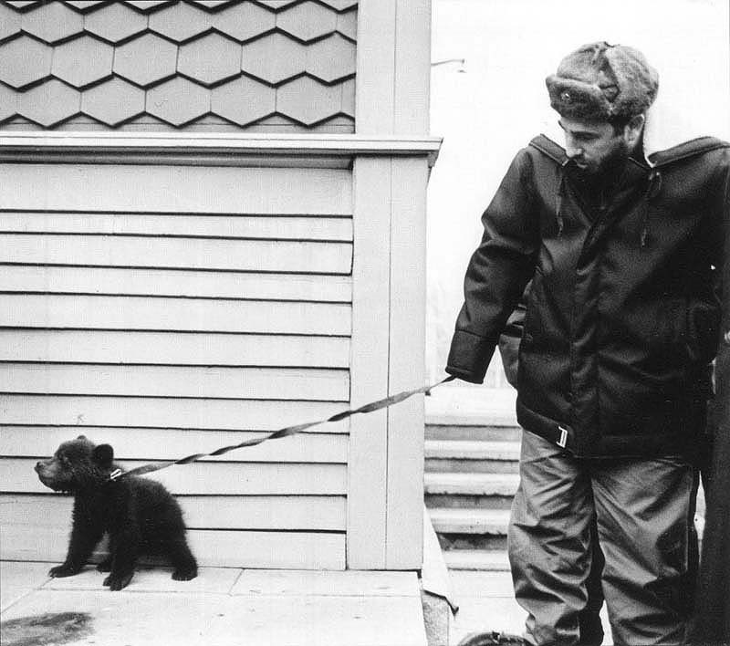 21. Фидель Кастро с медвежонком по имени Байкал, подаренным ему сибирскими геологами. Медвежонок отправился вместе с новым хозяином на Кубу, но, к сожалению, не смог адаптироваться в непривычном тропическом климате.