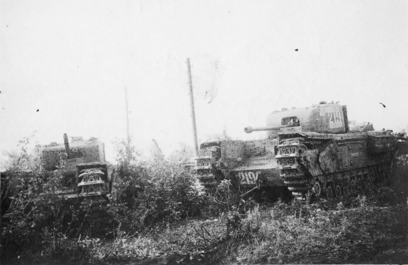 Советские пехотные танки Mk IV «Черчилль» (Infantry Tank Mk IV, Churchill (A22), английского производства из 36-го гвардейского отдельного тяжелого танкового полка прорыва 18-го танкового корпуса 5-й гвардейской танковой армии на Курской дуге. Машины из танковой колонны «За Радянську Україну» («За Советскую Украину»). Воронежский фронт.