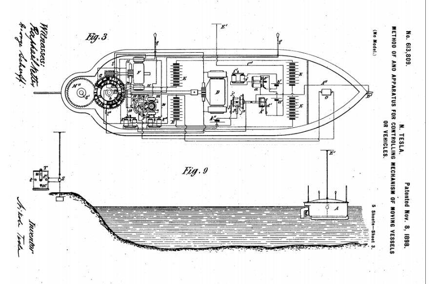 Патент от 8 ноября 1898 года называется «Метод работы и действия контролирующего механизма судов и двигающихся экипажей» и предполагает беспроводное управление корабля на электрическом ходу.