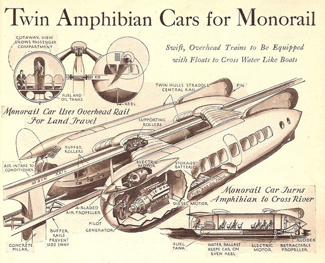В 1933 году механик-моторист Севастьян Вальднер, а точнее, барон фон Вальднер (изобретатель происходил из рода эльзасских немцев, приехавших в Россию после Французской революции) запатентовал свое изобретение — скоростной монорельсовый вагон. Две гондолы обтекаемой формы, соединенные в верхней части двумя крыльями малого удлинения, как бы охватывают расположенные треугольником несущие рельсы эстакады. Центр тяжести всей системы находится ниже верхнего рельса, так что вагон весьма устойчив. Опорные тележки располагаются в крыльях и передают на верхний рельс вес вагона, а направляющие горизонтальные колеса размещены в нижних частях гондол и соприкасаются с нижними рельсами, удерживая вагон на виражах.Горизонтальные колеса соединены с вагоном гидравлической пружинной муфтой, между буксой и рамой установлены резиновые прокладки (подобные элементы будут внедряться на железнодорожном транспорте лишь в 1950-е годы). Аэропоезд вмещает 300 пассажиров — как современный широкофюзеляжный аэробус. Два двигателя по 530 л. с. с воздушными винтами будут гнать этот нелетающий самолет по рельсам эстакады со скоростью 250–300 км/ч.