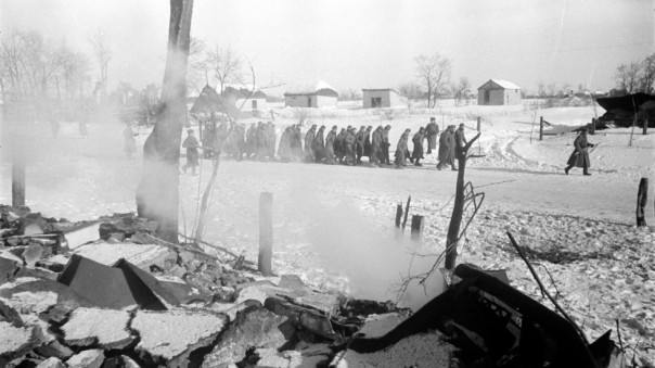 Колонна немецких военнопленных на улице разрушенной деревни под Сталинградом. Фото: © Военный альбом