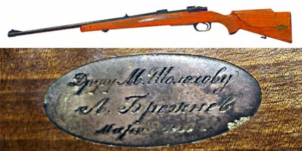 … Из охотничьего оружия Брежневу больше всего нравились винчестер, подаренный ему на 60-летие Михаилом Шолоховым, и карабин системы Маузера, выпущенный фирмой «Голланд — Голланд», подарок маршала Гречко».