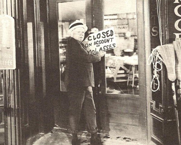 Через мгновение после аварии на бостонскую улицу Commercial Street обрушилась волна черной сырой патоки высотой в два этажа. Все это происходило во время постепенной реализации сухого закона. Ферментированная меласса в то время широко использовалась для получения этанола. Накануне введения полного запрета владельцы, соответственно, стремились изготовить и реализовать как можно большее количество продукции…