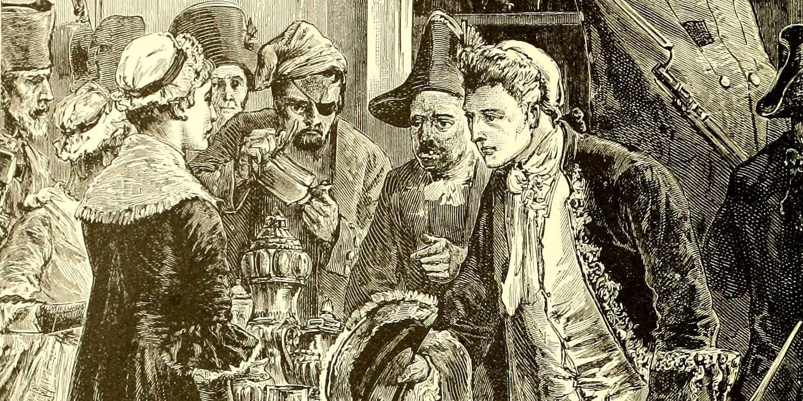 Но никого важнее графского садовника люди Джонса поначалу не встретили, да и тот убежал. Граф на острове отсутствовал. Команда стала проситься хоть особняк пограбить, раз уж выпить не удалось. Тогла Джон Пол разрешил революционным морякам экспроприировать фамильное серебро. Только и исключительно.
