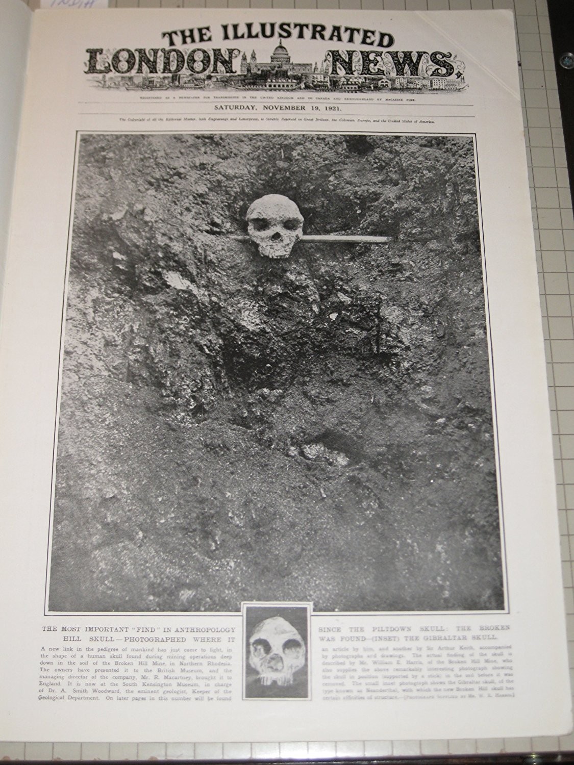 Титульный лист The Illustrated London News от 19 ноября 1921 г с фото родезийского черепа на месте находки (вверху) и черепа неандертальца из Гибралтара (внизу)