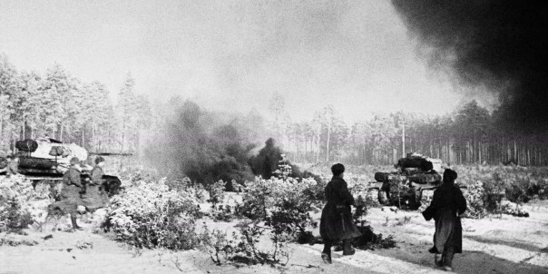 Советские танкисты на танках Т-34-85 взламывают немецкие оборонительные линии в Восточной Пруссии