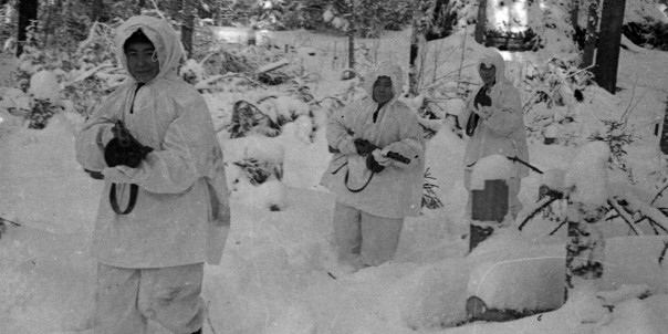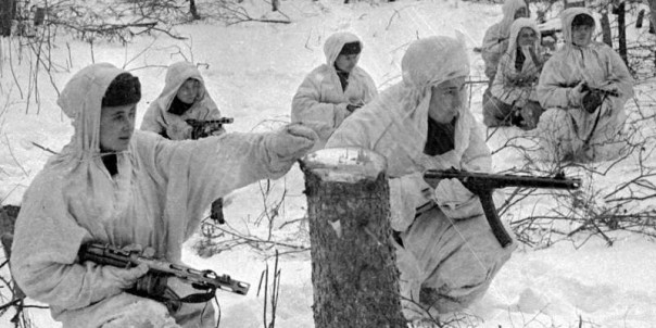 Советские разведчики в зимних маскхалатах выходят на боевое задание