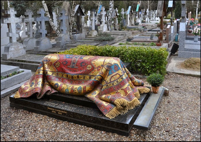 Если на дорожках кладбища к вам подойдет с вопросом француз, то почти наверняка он будет искать могилу Нуреева. Действительно, надгробие знаменитого танцовщика совершенно непохоже ни на какое другое, оно необычно и уникально, как уникален был человек под ним погребенный. Яркий, блестящий, нетрадиционный… Словно живой парчовый ковер только что наброшен на свежий могильный холм, и только присмотревшись, понимаешь, что это игра искусно выполненной мозаики.
