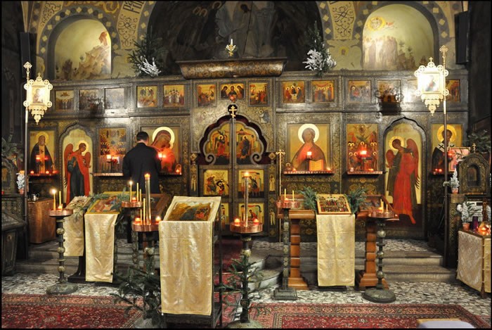 Внутри храма – строгий двухъярусный иконостас, расписанный художниками и прихожанами Львовой и Федоровым. На левой от входа стене изображены темы из жития Пресвятой Богородицы, на противоположной – сцены из жизни Христа. Как и росписи над апсидами, это – творение рук Альберта Бенуа. Западная (входная) стена расписана иконописцем Морозовым. В храме много икон – и на стенах, и на аналоях, и в киотах. Почти все они подарены русскими эмигрантами.
