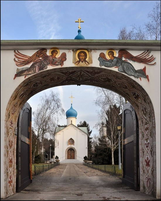 На арочных воротах при входе на кладбище изображены архангелы Гавриил и Михаил с иконой. Сразу за воротами по обе стороны ухоженной аллеи – березы и скамейки, а по бокам ступенек, ведущих в храм и вокруг храма, – елочки, кусты. В зелени деревьев и кустов справа от храма стоит звонница с маленьким куполом над двумя арками. Говорят, это единственный в Западной Европе ансамбль, созданный в псковско-новгородском стиле.