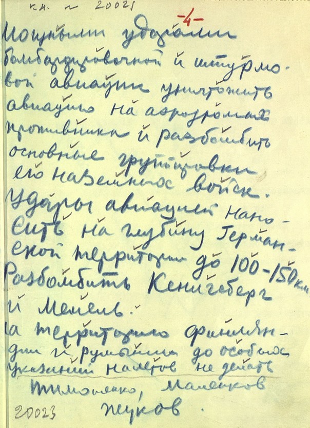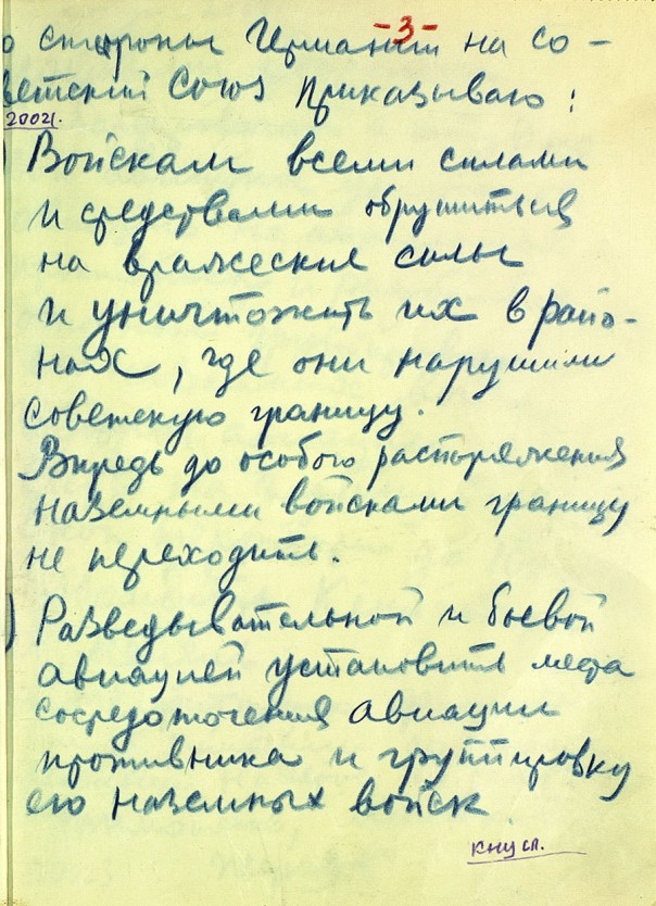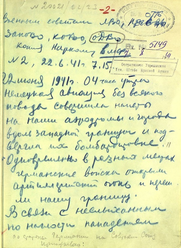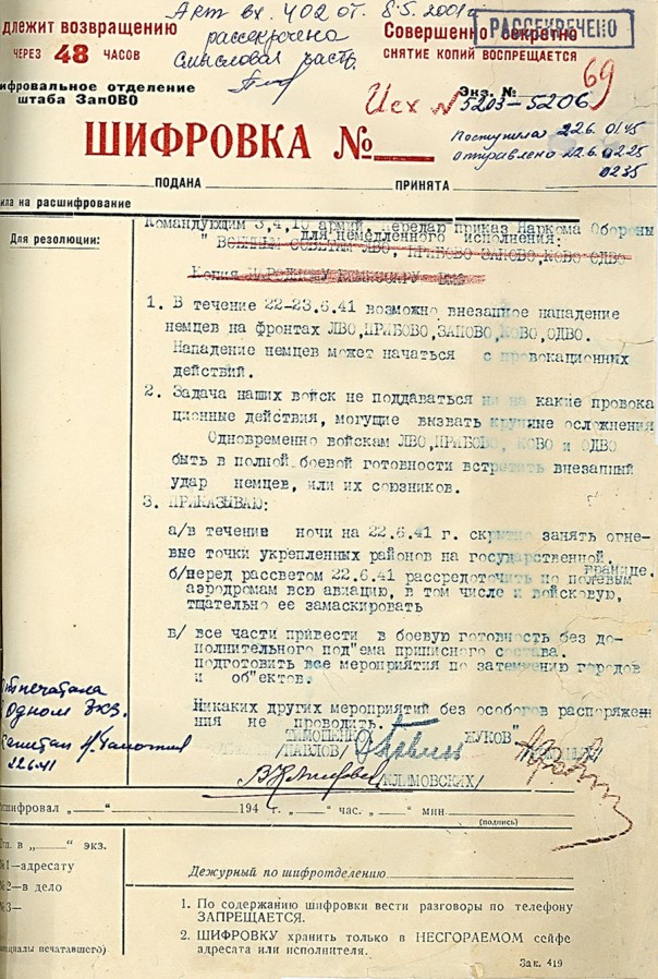 Среди документов — копия директивы наркомата обороны №1 от 22 июня 1941 года, подписанная начальником генштаба Георгием Жуковым и наркомом обороны Семеном Тимошенко и переданная в ночь на 22 июня командующим 3-й, 4-й и 10-й армиями, а также рассекреченная копия рукописного боевого приказа наркомата обороны №2 от 22 июня 1941 года, собственноручно составленного Жуковым спустя три часа после начала войны – в 7.15 утра. Приказ предписывает Красной армии "всеми силами и средствами обрушиться на вражеские силы и уничтожить их в районах, где они нарушили советскую границу", а бомбардировочной и штурмовой авиации уничтожать вражеские самолеты на аэродромах базирования и группировки наземных войск "на глубину германской территории до 100-150 километров".