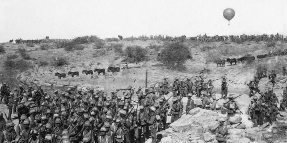 Английская пехотная колонна. На заднем плане — аэростат наблюдения
