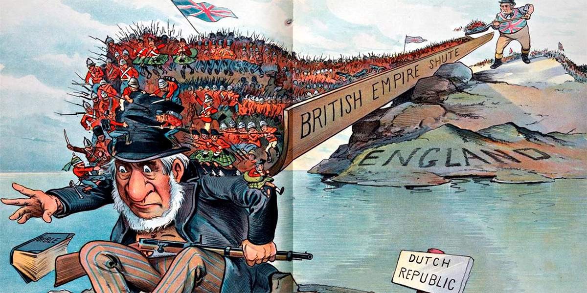 Джон Буль сгребает английских солдат в жёлоб, по которому они ссыпаются к «голландской республике» на голову Пауля Крюгера