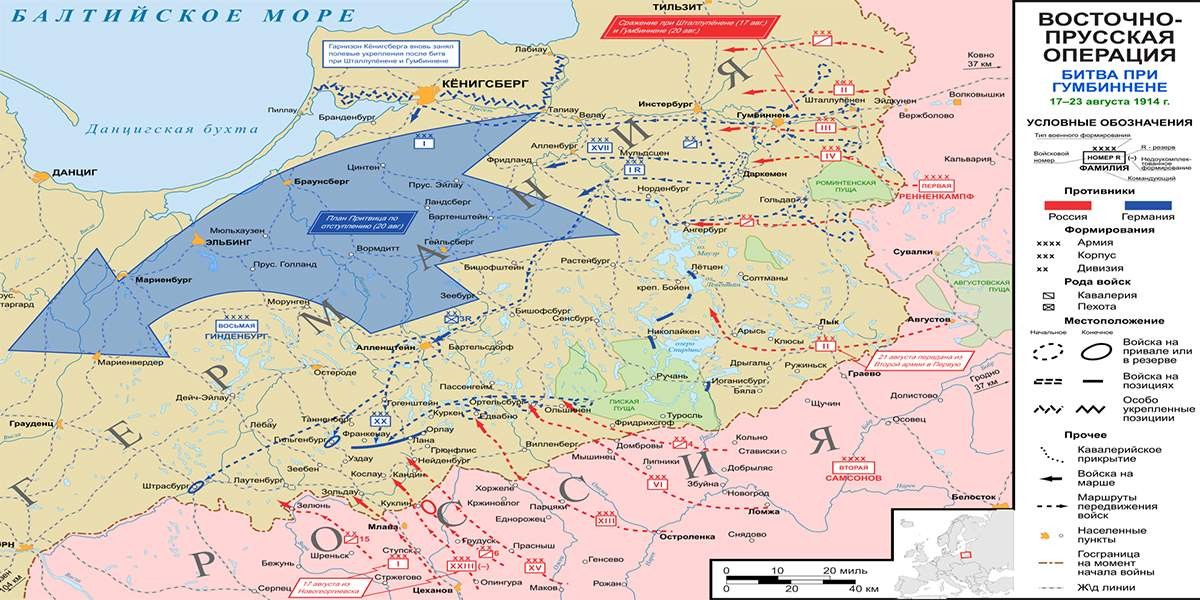 17 августа 1-я русская армия Северо-Западного фронта и 20 августа 2-я армия перешли границу Восточной Пруссии. Планировалось отрезать немцев на правом берегу Вислы и уничтожить их 8-ю армию. А после занять всю Восточную Пруссию. Далее можно было переходить к наступлению в сторону Берлина с позненского направления.