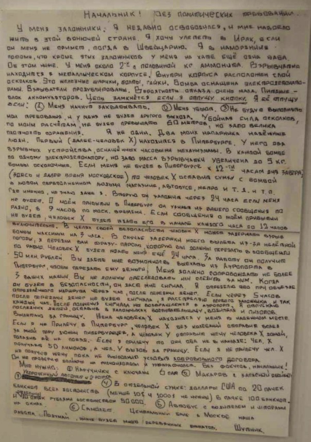 Бандит требовал, чтобы ему немедленно принесли боевой пистолет, крупную сумму денег в разных валютах и предоставили самолет до Ленинграда, где у него якобы находились сообщники. Переговоры вели специально обученные сотрудники ФСК.